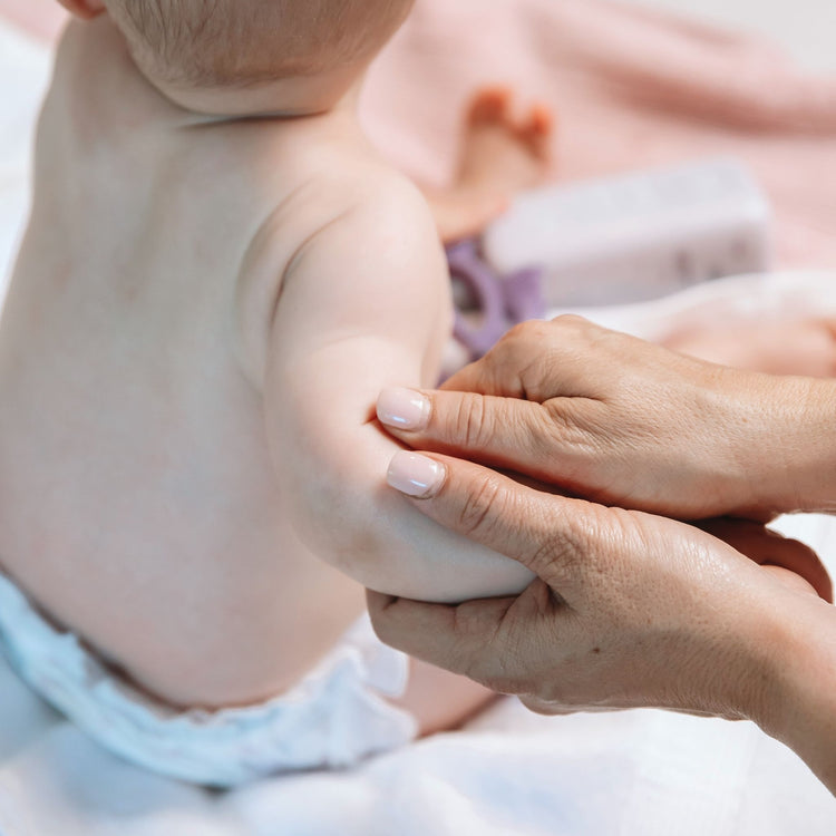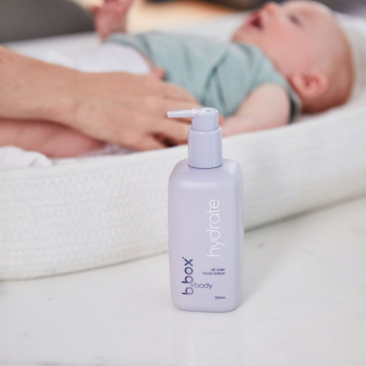 入浴後、肌がまだ少し湿っている状態で保湿することが大切です。「hydrate / ハイドレート ボディローション」や「moisture / モイスチャー ボディ+バスオイル」は、化学物質や合成物質を含まない植物由来成分で、赤ちゃんの敏感な肌に優しく潤いを与えます。