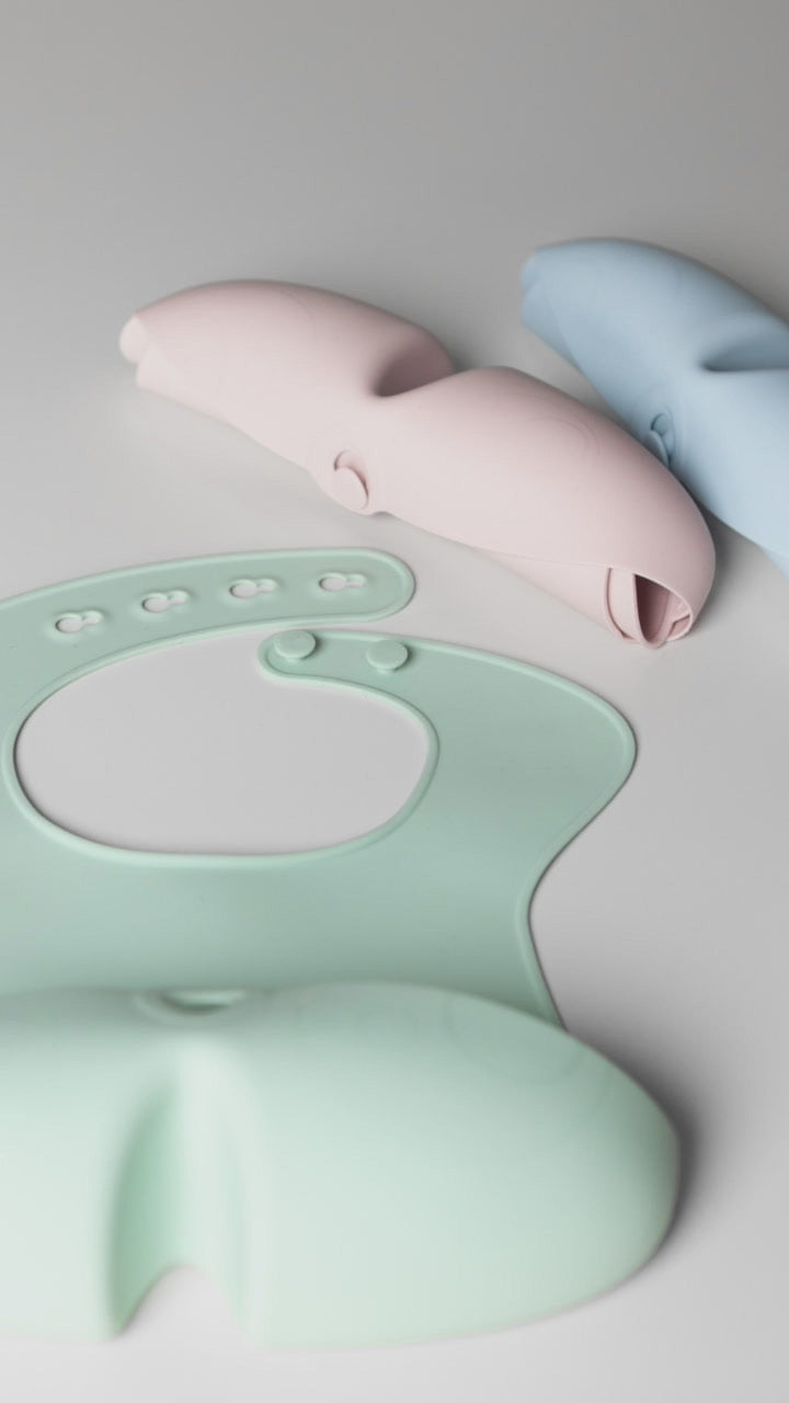 深さもあり、中に仕切りが付いた「ステイオープン」ポケット設計が特徴のシリコンビブです。