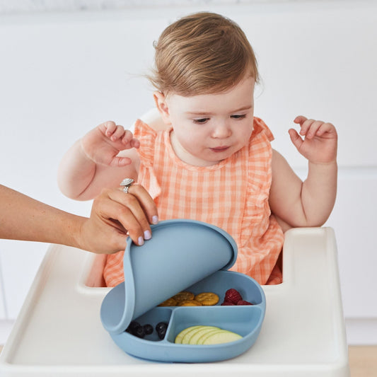 吸盤付きなのにスタイリッシュで使いやすさを追求したデザインのシリコンプレートは離乳食だけでなく、おやつにも対応します。